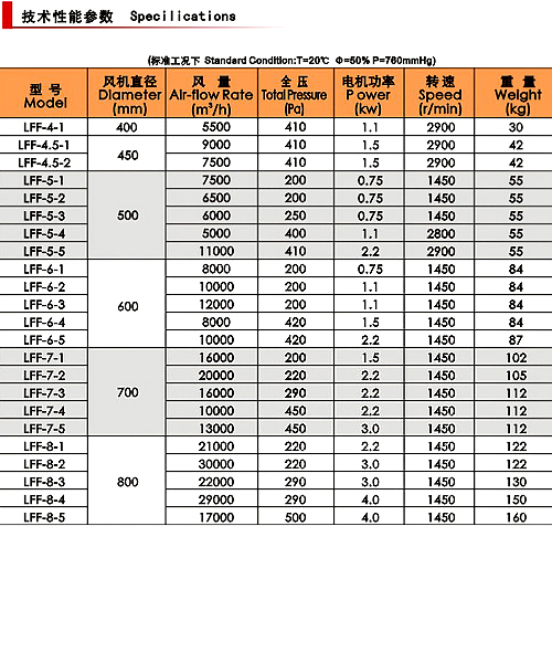本系列风机叶轮直径由小到大共分为4、4.5、5、6、7、8等六种机号,风量5500~30000m3/h,风压200~500Pa(详见参数表)。